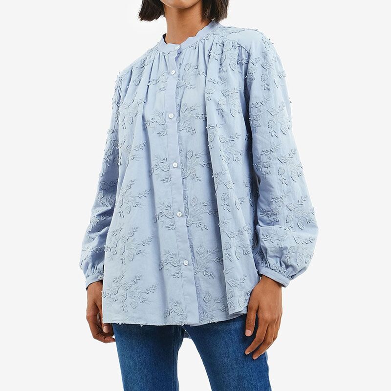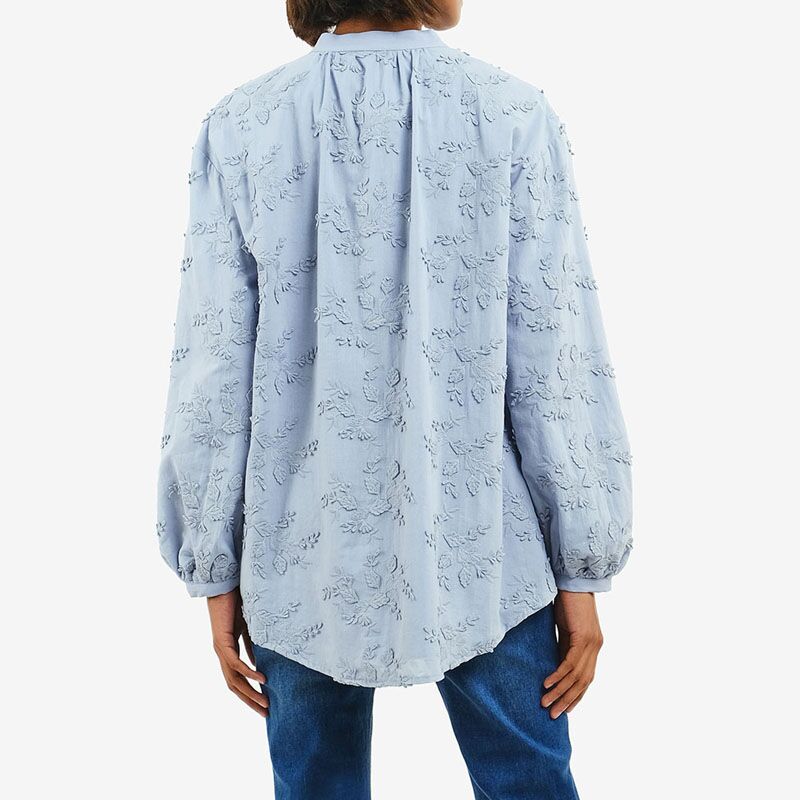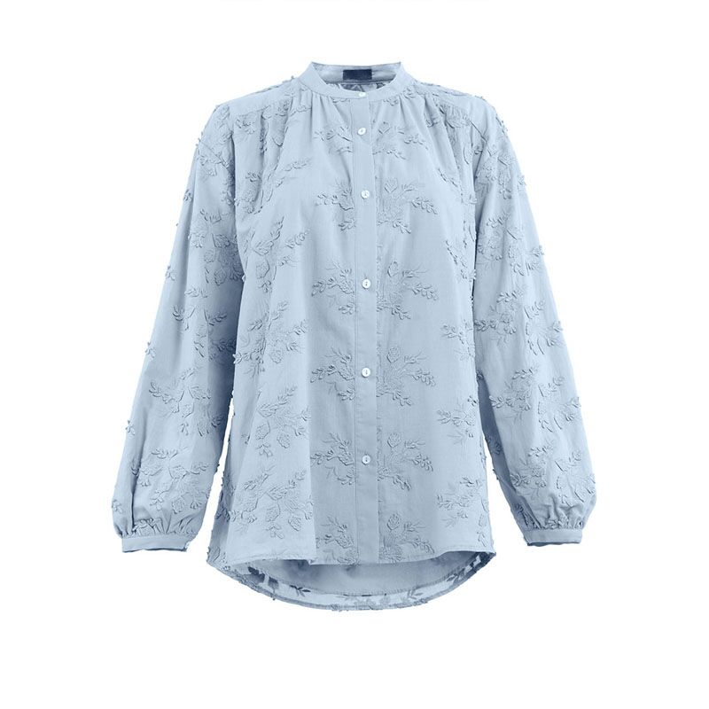 Embroidery Crew Neck Muslim Blouse-Blue