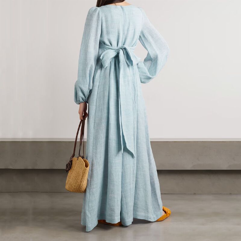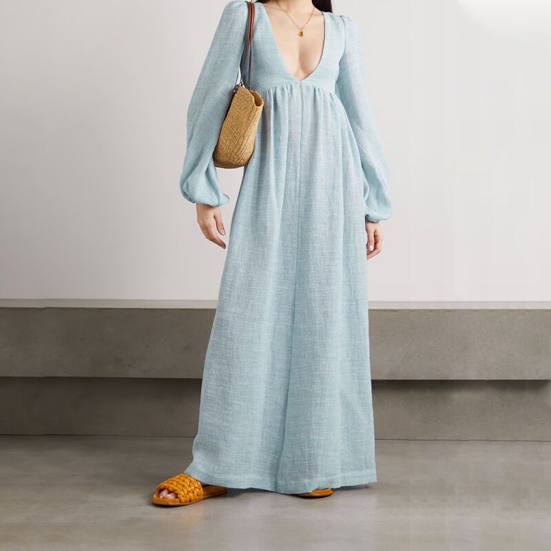 Loose V Neck Maxi Linen Casual Dress – Sky Blue