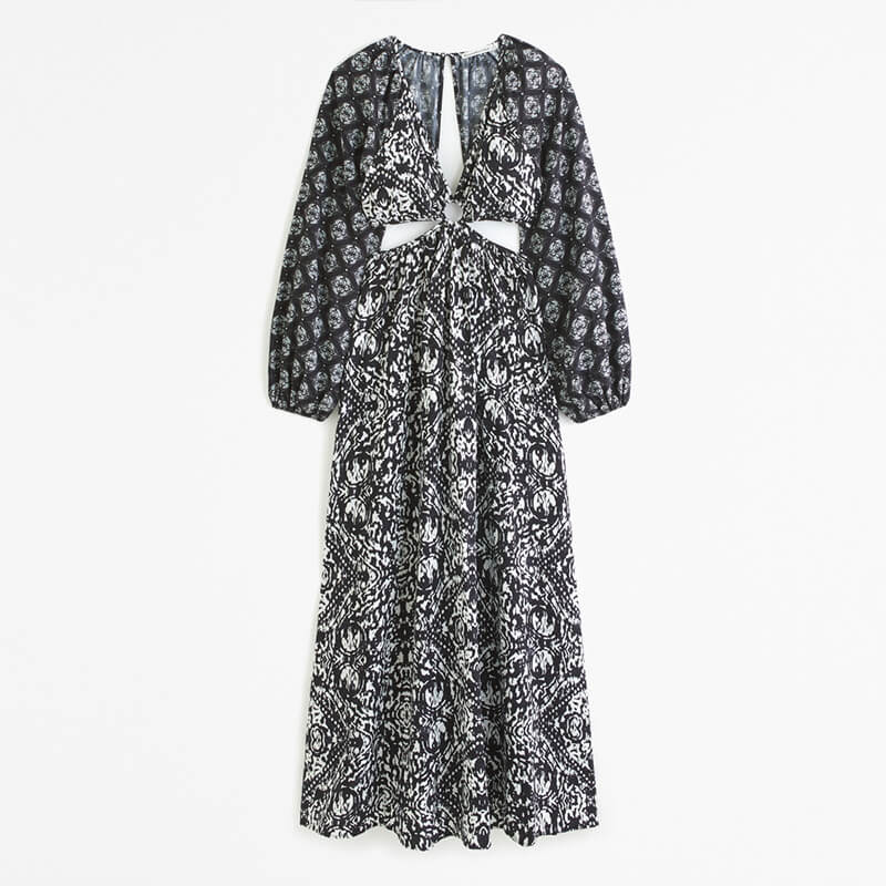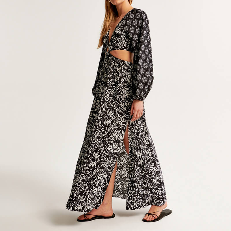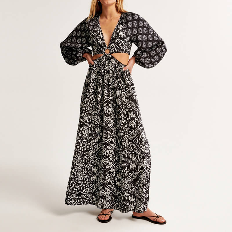 Printing Long sleeve v neck plunge cutout maxi dress