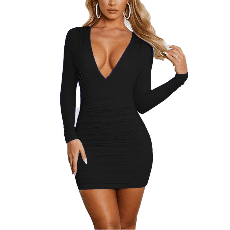 Sexy Long Sleeve V Neck Ruched Bodycon Party Cocktail Mini Dress