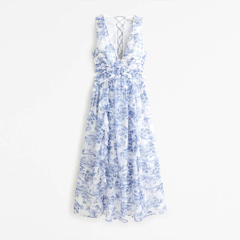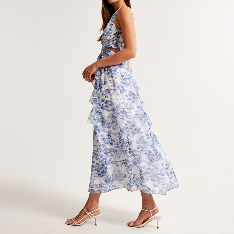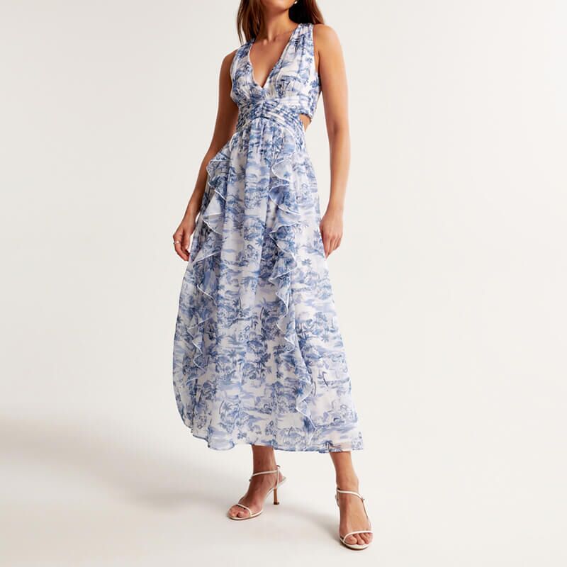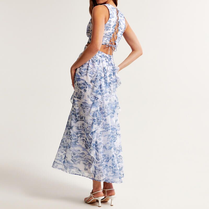 Sleeveless v neck printing lace up back maxi dress